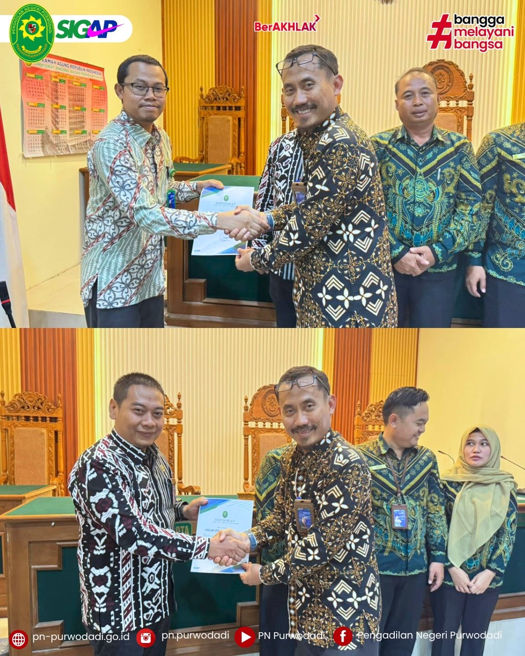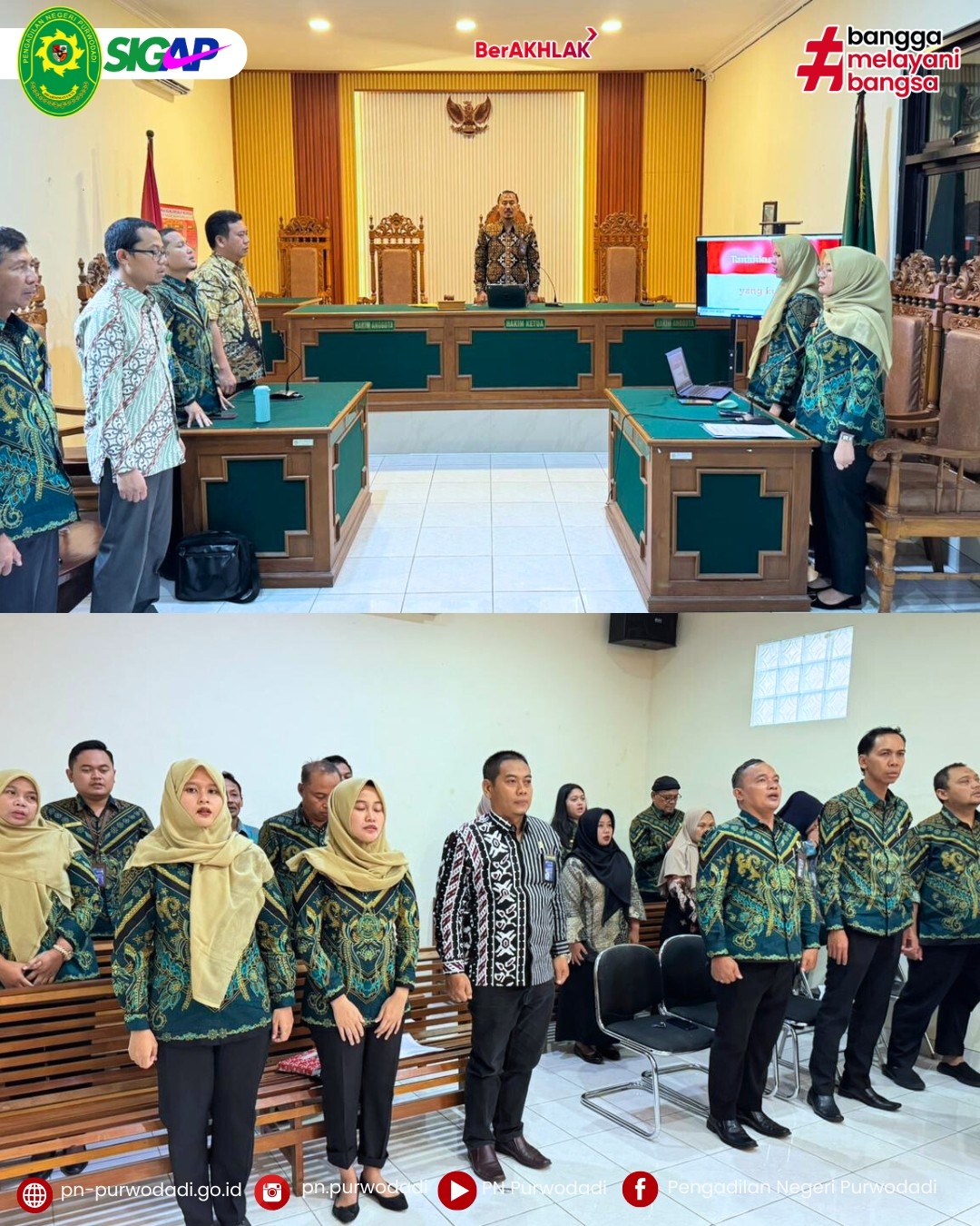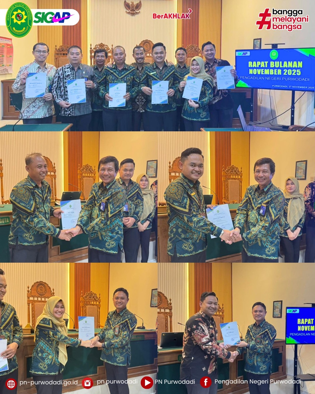 Seluruh ASN Pengadilan Negeri Purwodadi hadir untuk mendengarkan dan menindaklanjuti arahan sebagai upaya berkelanjutan dalam meningkatkan kualitas pelayanan publik dan kinerja lembaga. Pada kesempatan ini pula diserahkan penghargaan kepada pegawai terbaik bulan November 2025 sebagai bentuk apresiasi atas dedikasi dan profesionalisme. Penghargaan ini diberikan kepada Hakim, Panitera Pengganti, Jurusita, ASN, petugas PTSP, dan PPNPN / PPPK terbaik.