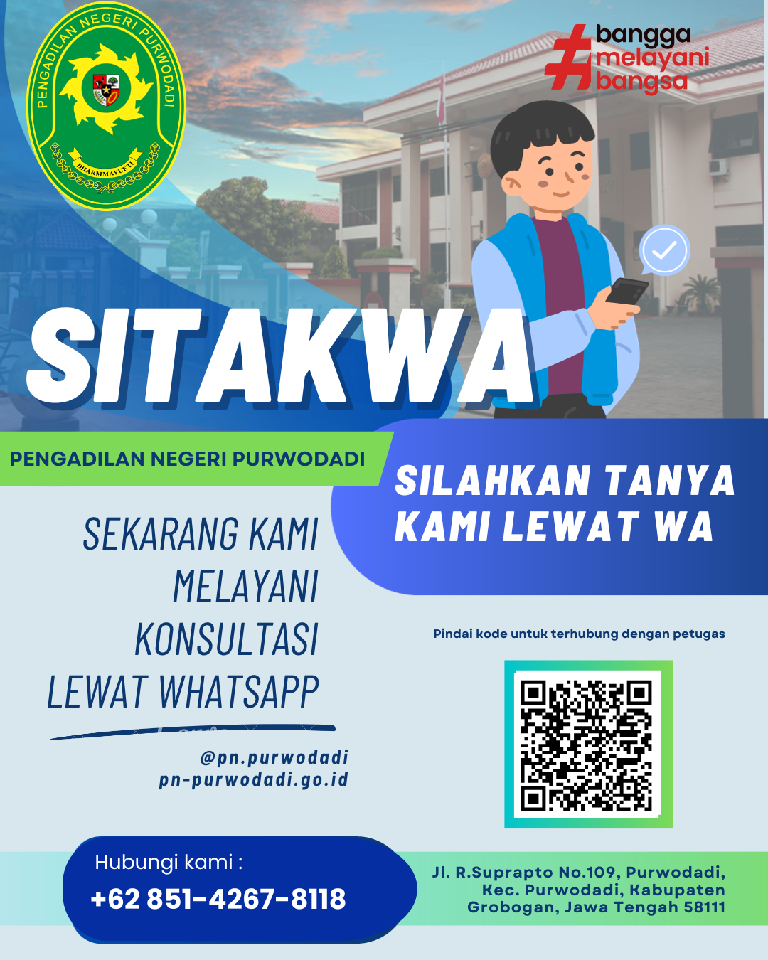 Kami Siap Memberikan Pelayanan Prima Pengadilan Negeri Purwodadi telah menerapkan slogan 3-S ( Sapa Senyum Salam). sebagai bentuk wujud dalam memberikan Pelayanan Prima kepada masyarakat. Disamping sikap dan karakter yang dikembangkan, juga disediakan MEJA INFORMASI dan LAYANAN WEBSITE untuk mengakses INFORMASI PERKARA. Lebih Lanjut